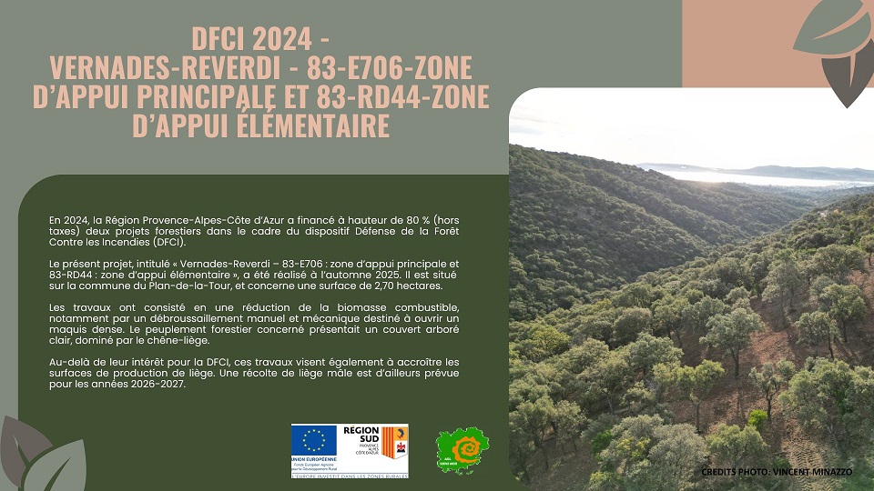 Ces travaux, financés par La Région Sud Provence-Alpes-Côte d’Azur, le Département du Var et le dispositif RESPIR, visent à accompagner dans le temps la régénération naturelle des espaces forestiers brulés vers des formations plus résilientes aux incendies et au changement climatique, tout en y favorisant la biodiversité les productions forestières (liège, arbouses, …)